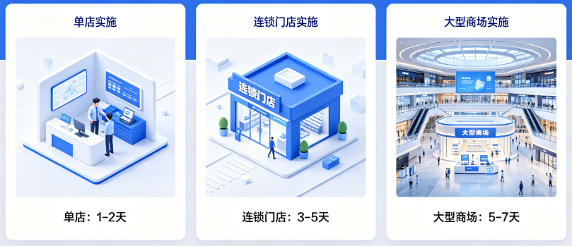 - 单店(便利店 / 超市):1-2 天完成部署 + 培训 + 上线;