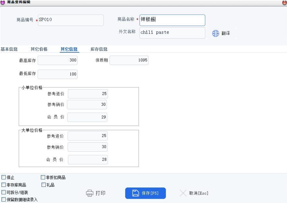 - 商品资料标准化:通过“商品资料编辑”,统一录入商品名称(中英双语)、规格、价格、库存上下限等,确保“数据一致性”。