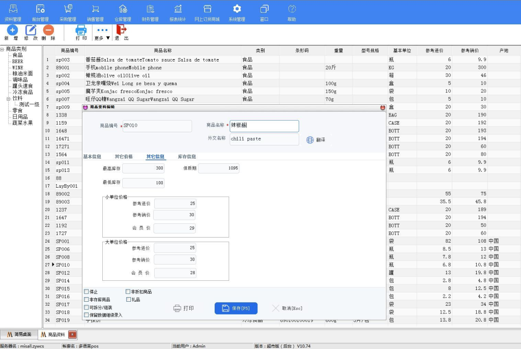 以“商品资料编辑”为例,用户可录入“辣椒酱(chili paste)”的商品编号(SP010)、最高/最低库存(300/100)、保质期(1095天)、参考进价(25)、参考销价(30)等,并支持小单位(瓶)与大单位(箱)的价格管理。同时,左侧“商品类别”可自定义扩展(如新增“赞比亚特色农产品”类别),满足本地化商品分类需求。