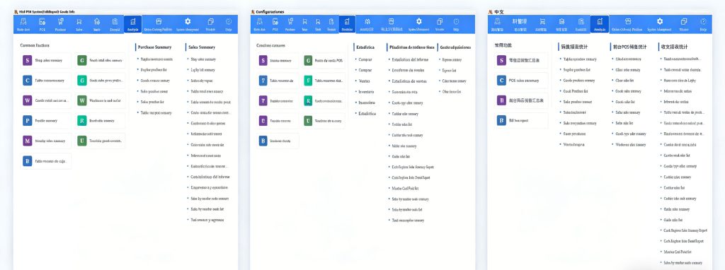中文版的核心亮点:界面简洁直观,符合华人的操作习惯,无论是库存查询、收银开单,还是会员管理、报表统计,都能快速上手;支持繁体中文,适配中国台湾、中国香港以及海外使用繁体中文的华人商户;可一键切换其他语言,方便本地员工操作,实现“老板用中文,员工用本地语言”的高效协作模式;所有单据、报表均可输出中文版本,方便华人老板核对数据、管理账目。