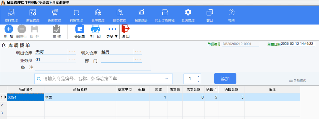 对于存在对个仓库或者分支机构的企业老说,将货品在不同仓库之前进行调拨,是一种较为常见的业务。当发生这类业务时,使用本模块来记录与调拨业务相关的各项数据:调入、调出仓库名称,调拨商品的编号、名称、规格和数量,以及用于财务结算的调拨价格。审核后,分别作为调入、调出仓库的入库、出库依据。