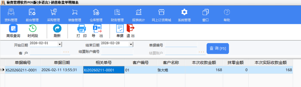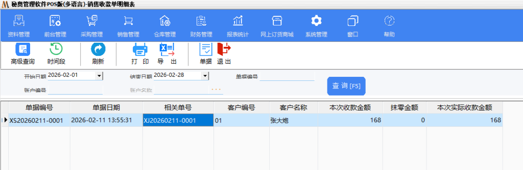 单击【财务管理】→【单据报表】→【销售收款单明细表】