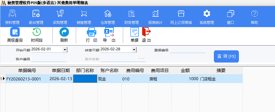 单击【财务管理】→【单据报表】→【其他费用单明细表】