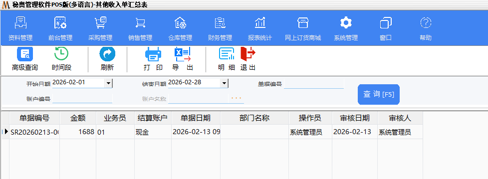 单击【财务管理】→【单据报表】→【其他收入单汇明细】