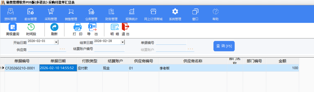 单击【财务管理】→【单据报表】→【采购付款单汇总表】
