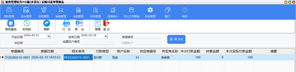 单击【财务管理】→【单据报表】→【采购付款单明细表】