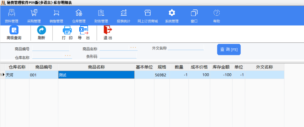 此报表是当前仓库的商品库存数量明细表,您可以在此模块查询各个商品的库存与成本。