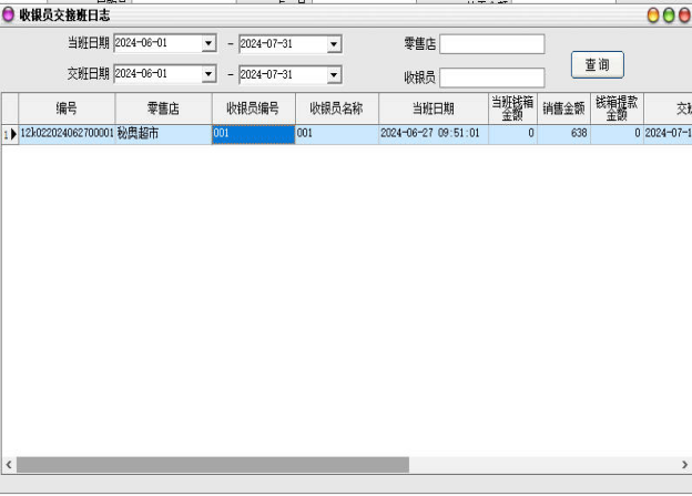 该模块用于后台查询前台收银员前箱的收支与交接班信息。