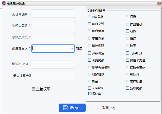 此模块主要用于前台收银员详细资料,收银员的权限也在此设置
