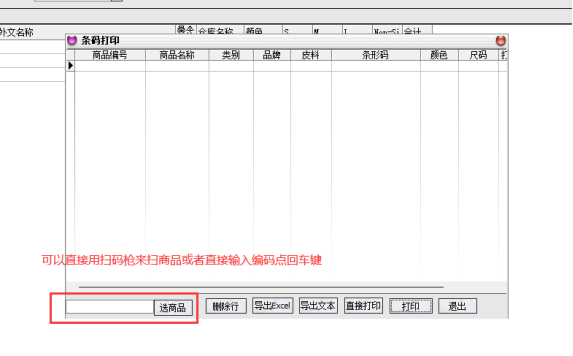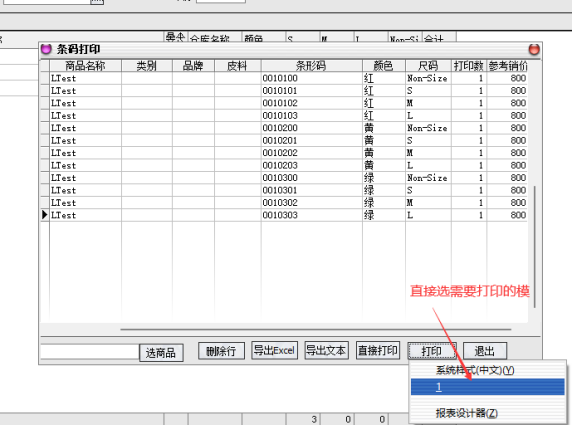 第一步:可以根据需求直接选商品或者使用扫码枪去选着需要打印的商品,带出的商品可以根据自己的需求去选择打印,如果带出来的颜色有不需要的,直接删除行就可删除其中一个颜色。