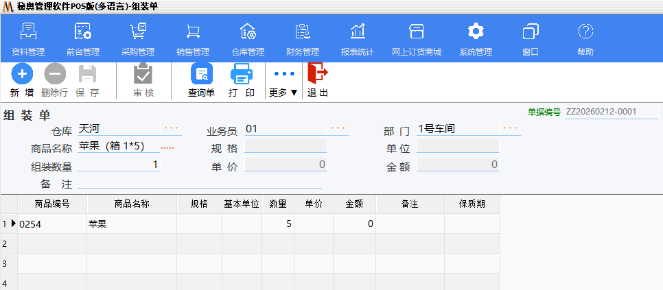 组装是指将散件组装成商品,或单个商品组成一个套装商品的业务。本系统通过【组装单】进行相关业务处理,记录企业对商品进行组装的相关信息,同时形成组装类的出入库业务。