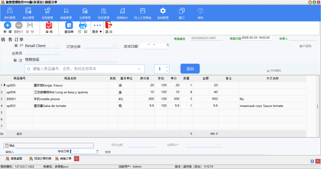 此处订单是用户在商城网页端里面下载好订单之后,会根据用户所下载的订单商品信息,自动带出订单,然后生成销售订单,可以在此查看所有订单信息并进入审核订单从而在销售出库时引单。