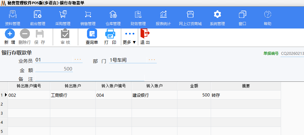2.选择转入账户,同时输入转出的金额,保存并审核后可以查看报表