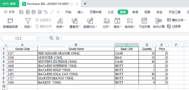 (note: Import form of warehouse receipt: the header must contain commodity number, commodity name, quantity and unit price. The unit price value can be filled in or not, and the price corresponding to the commodity information is called when not filled in.)