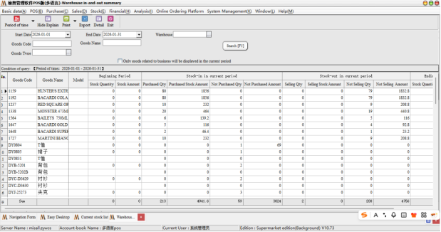 Operation Steps: report statistics → Warehouse Report statistics-in/out warehouse summary/out warehouse such as details (summary shows the total number, details show the number of specific documents; default query all)