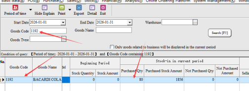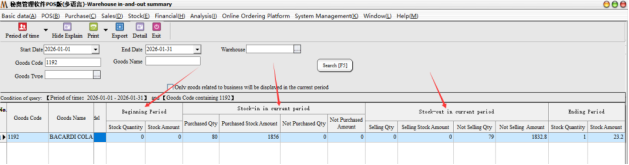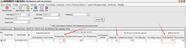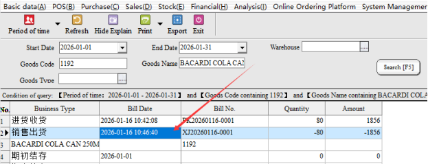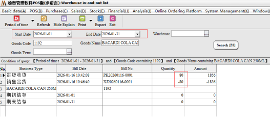 After bringing out the specific documents of the goods, it can be found that in 2026-01-01-2026-01-31, the goods have only been purchased and sold in and out of the warehouse during this time period. Assuming that the purchase quantity is correct, but the sales quantity is on the high side (the actual sales is 60) , then double-click the document number directly in this report to bring up the specific documents.