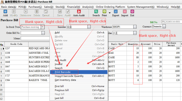 Operation Steps: purchasing management → purchasing warehousing list → select a blank right-click → bar code printing