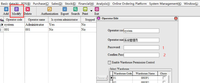 Enable warehouse permissions: If warehouse control permissions are checked, the corresponding operator can only view the data of the selected warehouse and the related invoicing and stockpiling operations. Example: I added a 001 staff, can only Shop1 warehouse operation permissions, the correct check permissions as follows: (Note: Do not enable warehouse control permissions default can view all operations of the warehouse)