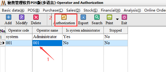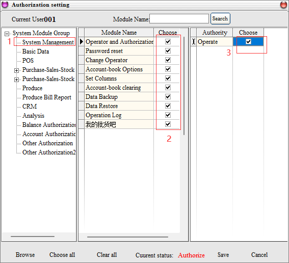 Example: 001 Operator, in the inventory module of the purchase management, all orders, can only view, add and modify permissions, other permissions are not available, the corresponding permissions set as follows: (others and so on)