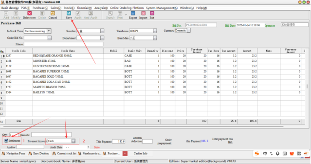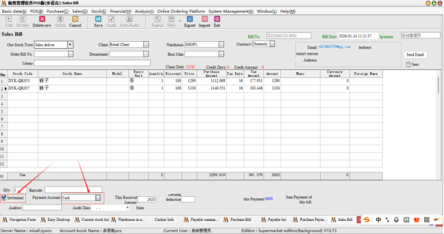 Steps: first of all, the software in the purchase payment list is to support the development of storage order when the direct collection of money, just in the time of issuing bills to check the money can be, as shown below: