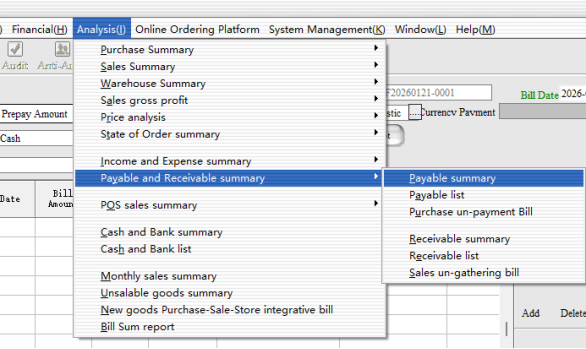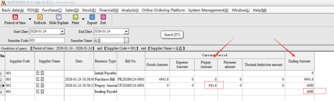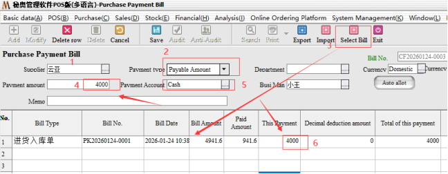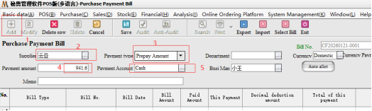 Step 3: the second end of the payment, we came to the purchase bill inside, select the corresponding supplier after we directly choose the payment type for“Payable”, can be a collection. The system will default to the amount we have paid
