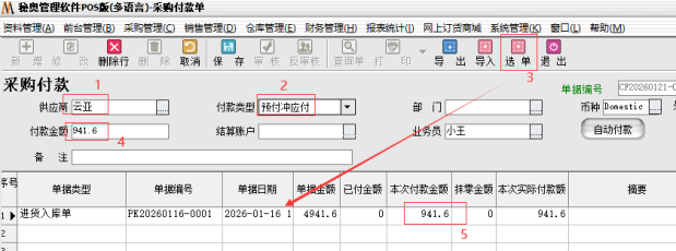 Step 2: GO to the purchase payment note, the purchase payment note for“Prepaid charge payable”, select the corresponding supplier, enter the amount received in advance (941.6) , and then click on the quotation, the single charge. At the same time in the document details, enter the amount of this payment (with the supplier under the payment amount to be consistent) .