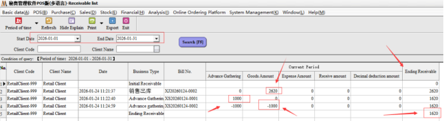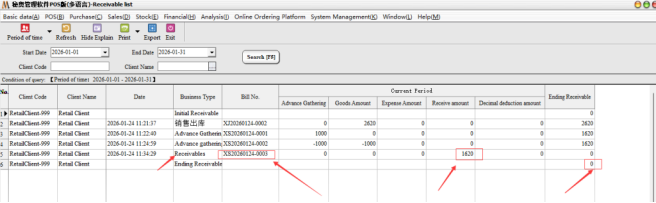After the appeal operation can complete the first partial collection, you can carry out customer arrears data view, statement statistics → Accounts Receivable, accounts payable statistics → Accounts receivable list