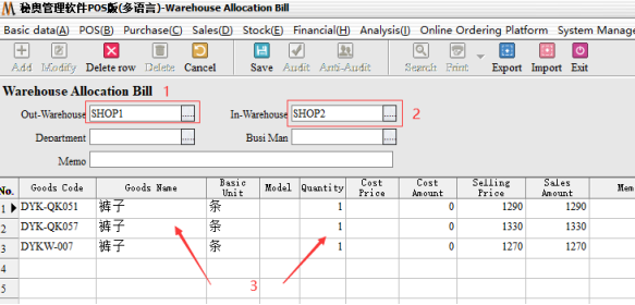 The first step: first select the transfer out of the warehouse, then select the transfer into the warehouse, the following input need to allocate the commodity information and quantity can be allocated by default is the cost price. (note: At the same time the quantity can also use Excel table import method with the same Excel method)