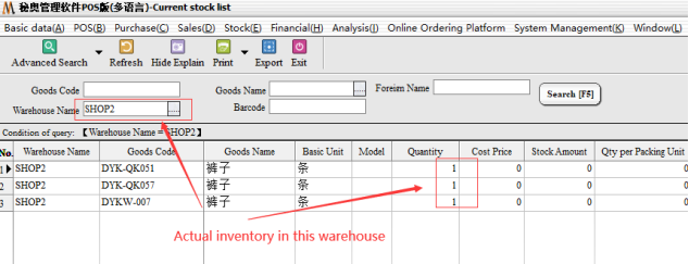 Step 2: After the transfer, you need to view the inventory separately, in the warehouse management → inventory details → Warehouse Shop2(demo warehouse) . The total amount of goods in stock remains the same, but the specific warehouse will show the actual inventory.