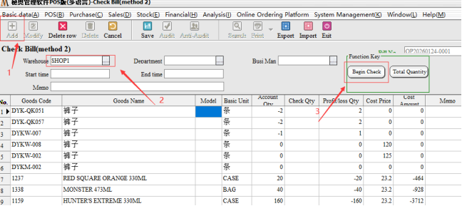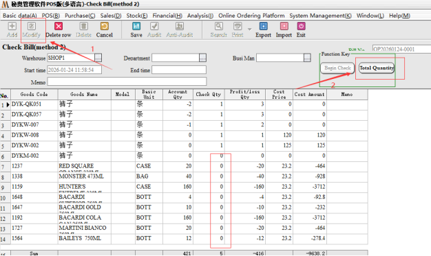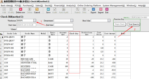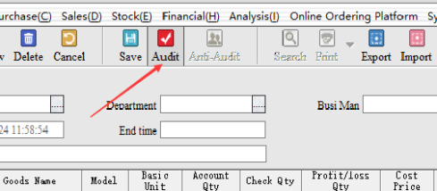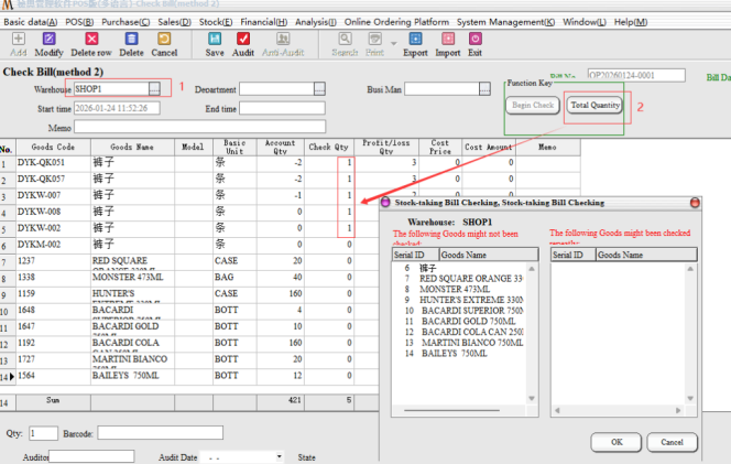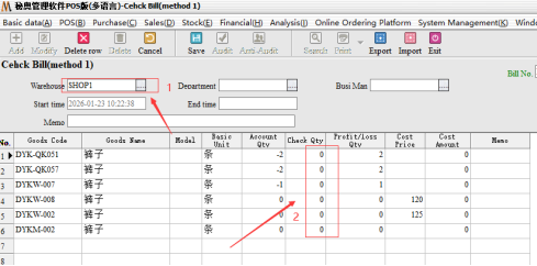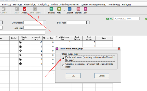 Step 2: Audit, after the audit need to choose the inventory method. Partial inventory: Only the selected part of other inventory remains unchanged; Full Inventory: for the Month/year store inventory, not selected goods, the default empty inventory.