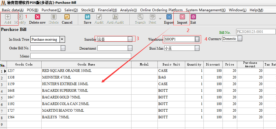 Remember to click on the new import documents, after the new selection of the corresponding warehouse and supplier directly after the click to import