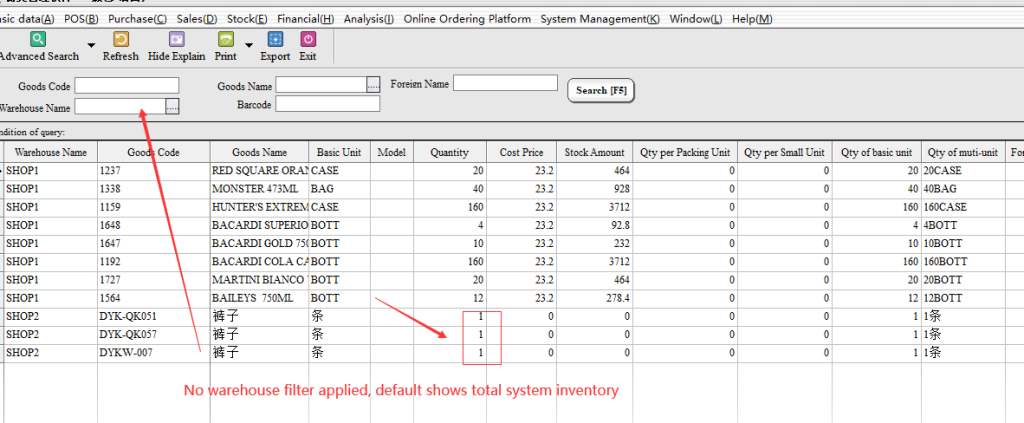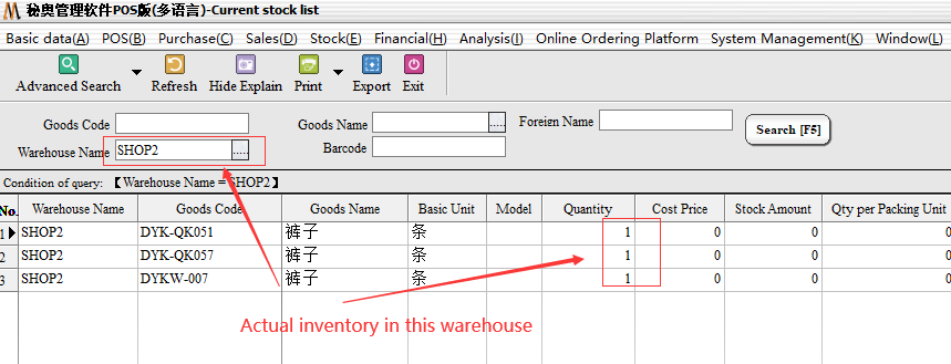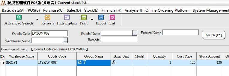 If you need to accurately check the current stock of a single item, enter the corresponding product number or name to query (if the selection of different warehouse corresponding warehouse, the default query the entire system inventory) example: need to query DYKW-008 inventory of goods, enter Dykw-008 in the item label column.