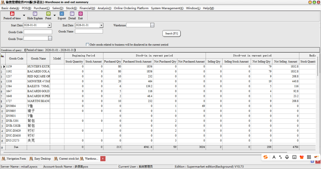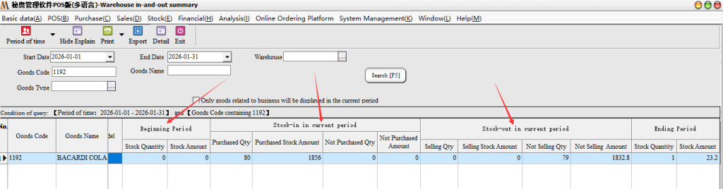 Operation Steps: report statistics → Warehouse Report statistics-in/out warehouse summary/out warehouse such as details (summary shows the total number, details show the number of specific documents; default query all)