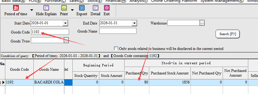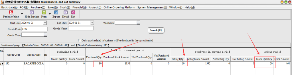 After bringing out the specific documents of the goods, it can be found that in 2026-01-01-2026-01-31, the goods have only been purchased and sold in and out of the warehouse during this time period. Assuming that the purchase quantity is correct, but the sales quantity is on the high side (the actual sales is 60) , then double-click the document number directly in this report to bring up the specific documents.