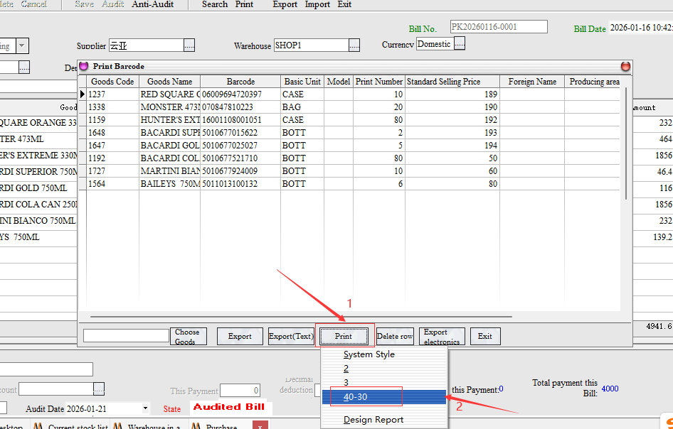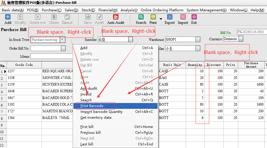 Operation Steps: purchasing management → purchasing warehousing list → select a blank right-click → bar code printing