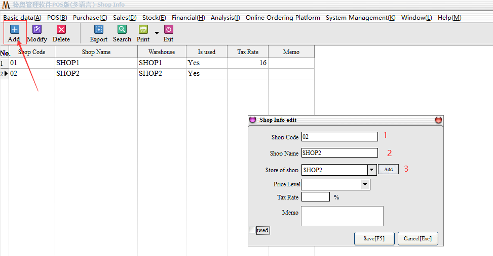First Click on the new, and then enter the store number, store name, store warehouse, the three must fill in the field, the other can be filled out as needed