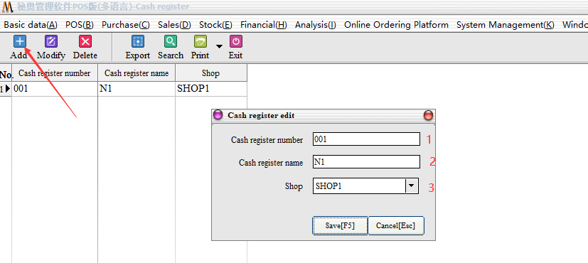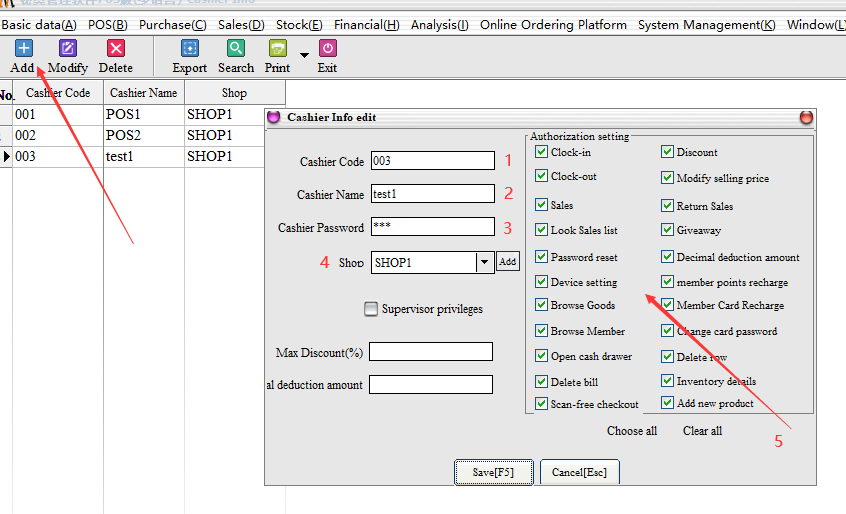 Click add, enter the cashier ID (login the front desk“User name”) , cashier name, cashier password, cashier permission settings (check on that means you can carry out the relevant authority operation, do not check that there is no permission) others can be filled according to the needs.