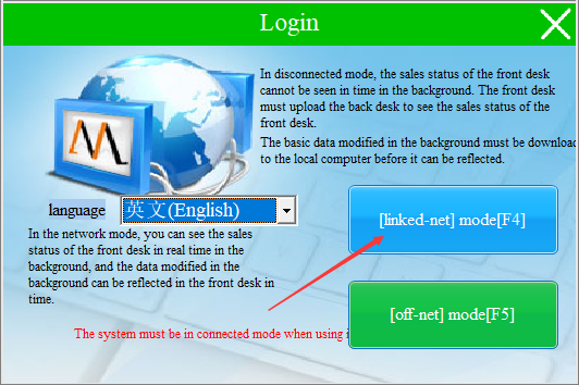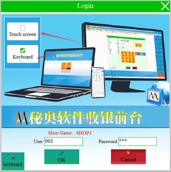 Enter the cashier account and password (Note: the user name is cashier ID) created in the background, you can choose the touch screen mode or keyboard mode according to your computer