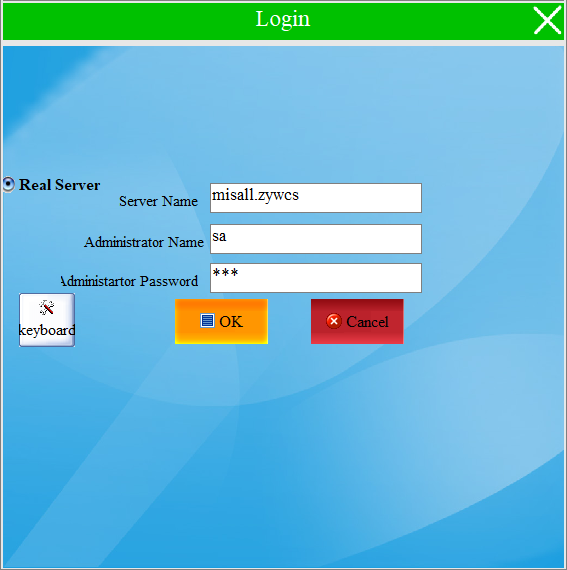 Login software we need to connect to the server for login configuration, double-click to open the software we can directly enter the corresponding server name, administrator account and password, when you’re done, just click next. (note: server domain name without spaces, admin name default: sa)