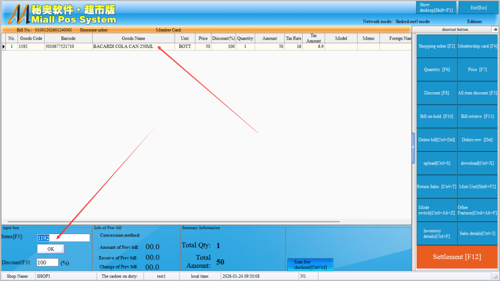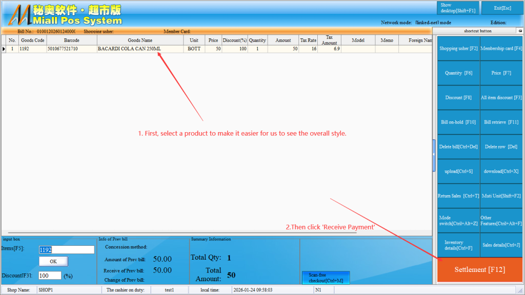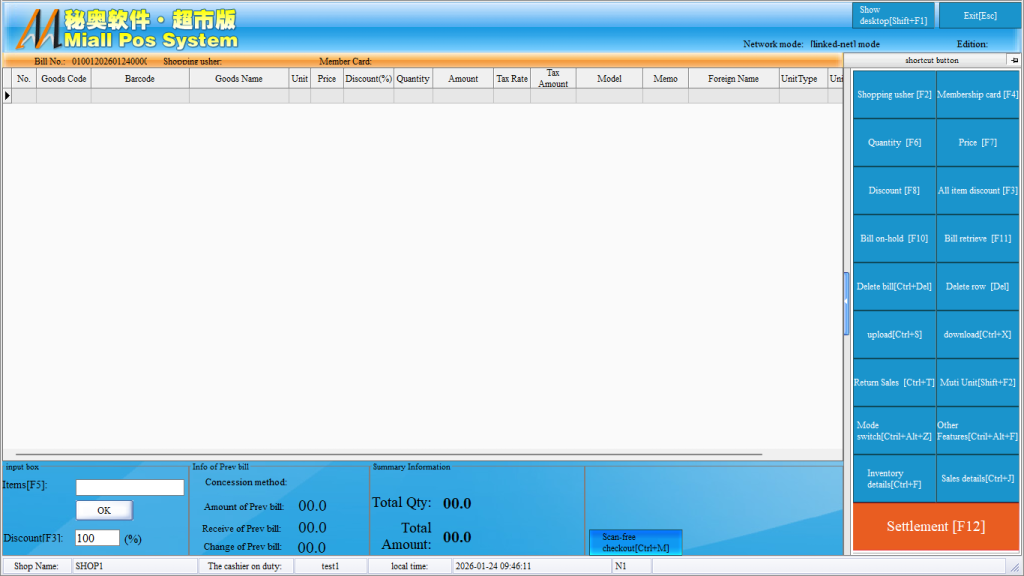 Step 3: After entering the cash register interface, you can normally carry out the cash register. You can directly use the code scanning gun to scan the second number, or directly enter the number to automatically take out the goods, on the right side, you can bind the shopping guide, membership card, unit price (change price) , quantity (modify the quantity) , discount (single discount) , the whole single fold (unified discount of all goods) , hanging list (hang up the order) , take out the single (take out the suspended order) , delete the single (delete a whole single) , delete the line (delete a single product) and other related operations