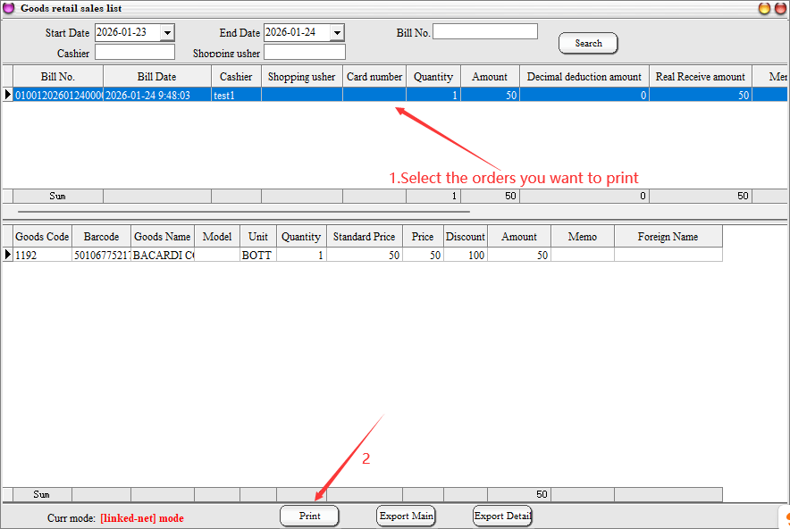 Step 4: need to see what the front desk sold and need to re-print receipts, click on the front desk sales details to see. To see which order to print, select the order and click print.