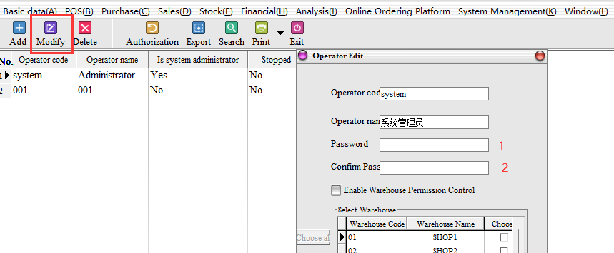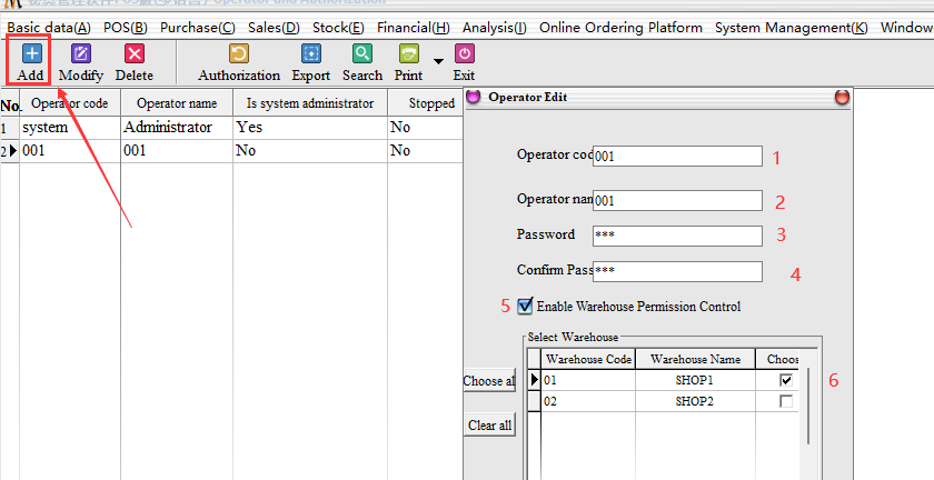 Enable warehouse permissions: If warehouse control permissions are checked, the corresponding operator can only view the data of the selected warehouse and the related invoicing and stockpiling operations. Example: I added a 001 staff, can only Shop1 warehouse operation permissions, the correct check permissions as follows: (Note: Do not enable warehouse control permissions default can view all operations of the warehouse)