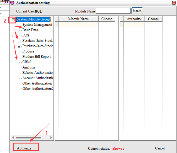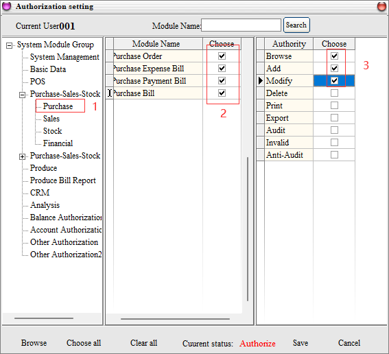 Example: 001 Operator, in the inventory module of the purchase management, all orders, can only view, add and modify permissions, other permissions are not available, the corresponding permissions set as follows: (others and so on)
