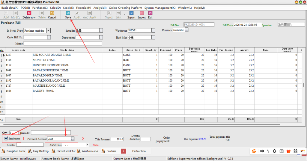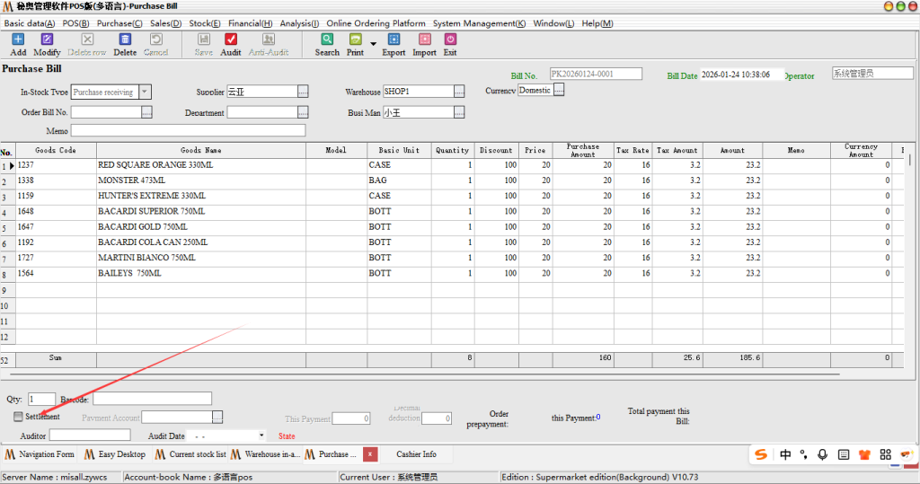Steps: first of all, the software in the purchase payment list is to support the development of storage order when the direct collection of money, just in the time of issuing bills to check the money can be, as shown below:
