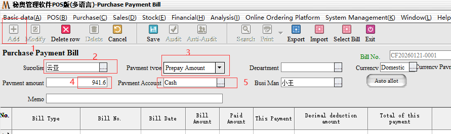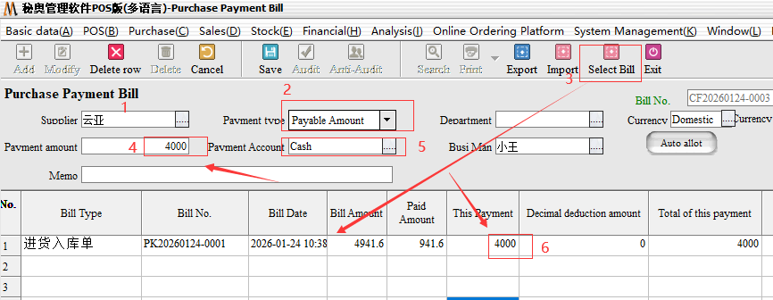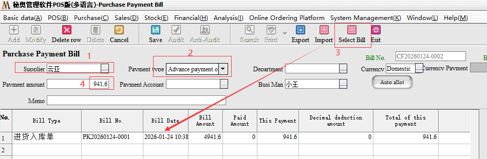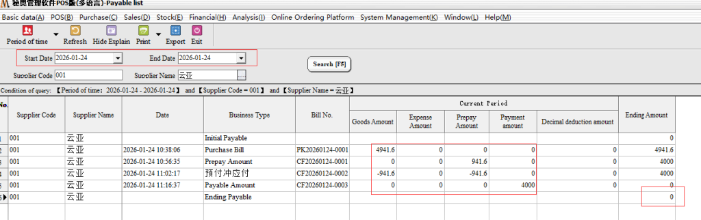 Step 3: the second end of the payment, we came to the purchase bill inside, select the corresponding supplier after we directly choose the payment type for“Payable”, can be a collection. The system will default to the amount we have paid