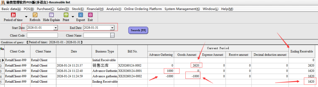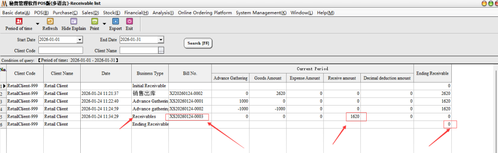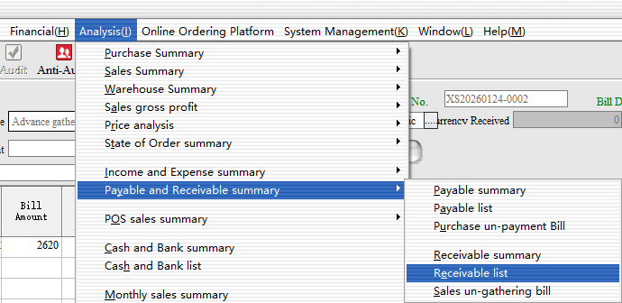 After the appeal operation can complete the first partial collection, you can carry out customer arrears data view, statement statistics → Accounts Receivable, accounts payable statistics → Accounts receivable list