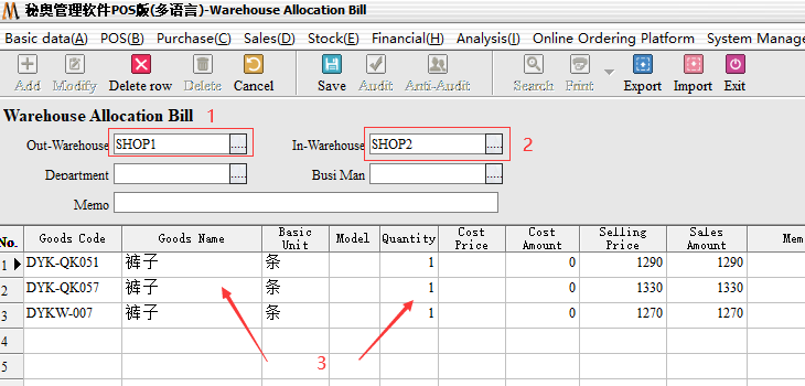 The first step: first select the transfer out of the warehouse, then select the transfer into the warehouse, the following input need to allocate the commodity information and quantity can be allocated by default is the cost price. (note: At the same time the quantity can also use Excel table import method with the same Excel method)