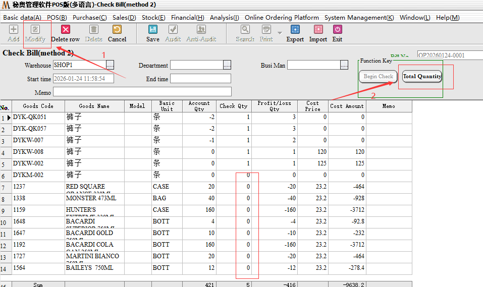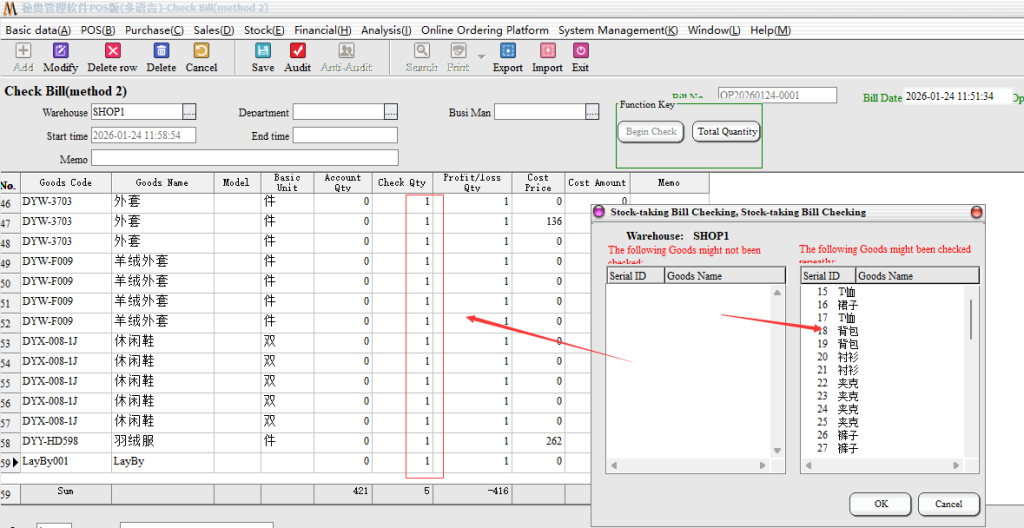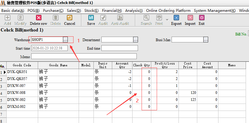 Step 2: Audit, after the audit need to choose the inventory method. Partial inventory: Only the selected part of other inventory remains unchanged; Full Inventory: for the Month/year store inventory, not selected goods, the default empty inventory.