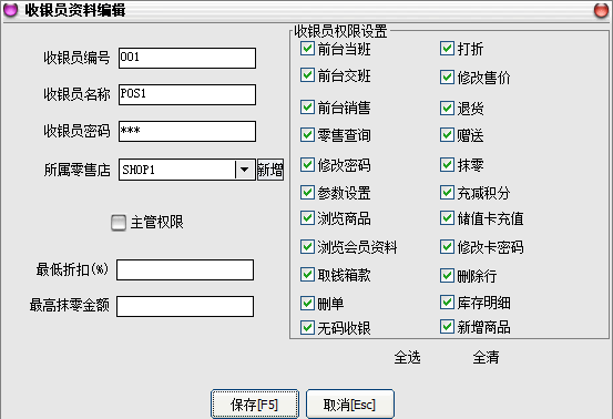 研究了一下发现其实还是挺简单的,直接在后台的前台管理里面,首先点击收银员资料,然后选中收银员之后,点击修改就可以了,同时还能修改密码,很方便,也很醒目!