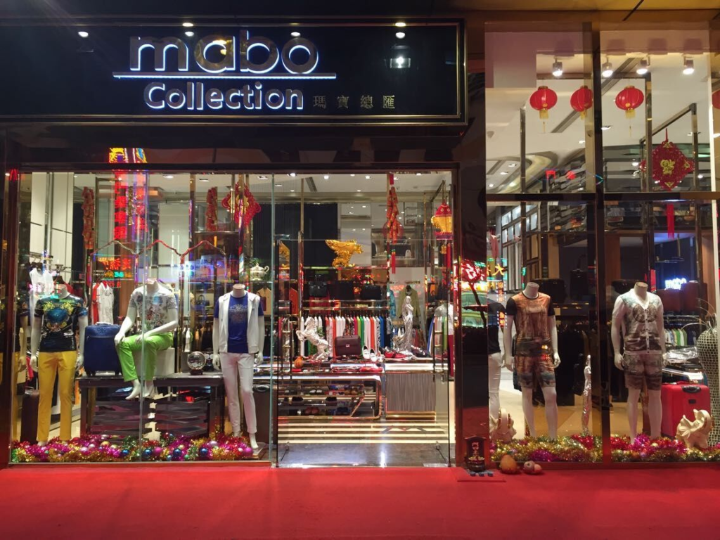 傍晚时分,商场里的mabo Collection依旧灯火通明。玻璃门外,红色地毯衬得店铺格外醒目;门内,模特身上的亮色衬衫与休闲裤,在灯光下散发着都市男装的精致感。